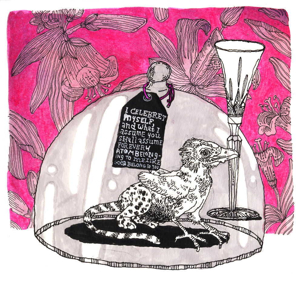This book started strange for me, and somehow just went from there. I didn't have a topic in mind, so I just did the daily challenges in Andrea's book and then tried (and somewhat failed) to tie it into a cohesive thing. This one was to make a drawing that mixes Great White Shark and poetry. I picked Walt Whitman so I can make this silly pun.